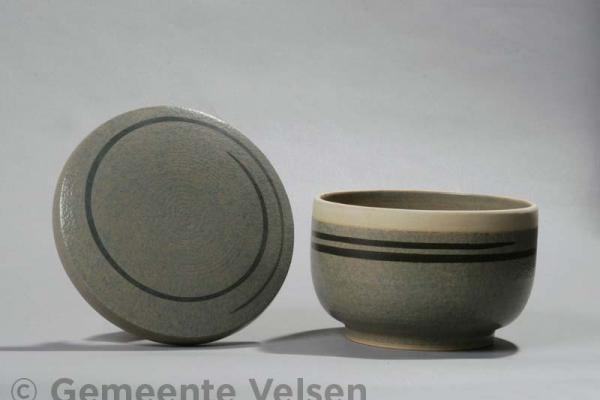 Dekselpot van steengoed klei, aangekocht op kunstmarkt.