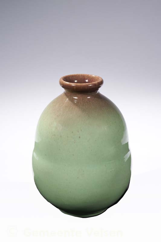 Aardewerk vaasje, kruikvormig, in het midden geknepen, uitgevoerd in lichtgroen en bij de hals grijs/beige met in bruin fabrieksmerk nr. 1 z.j.