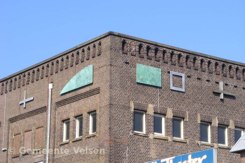 De 6 geometrische gevelplastieken zijn ‘s avonds verlicht.